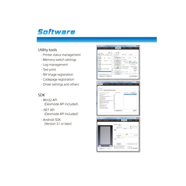 - Driver: Windows® XP/Vista/7(32bit/64bit), OPOS(XP/Vista/7/POSReady2009/POSReady7), POS for .Net (XP/Vista/7/POSReady2009/POSReady7), Linux(CUPS/SDK), Android™(SDK)